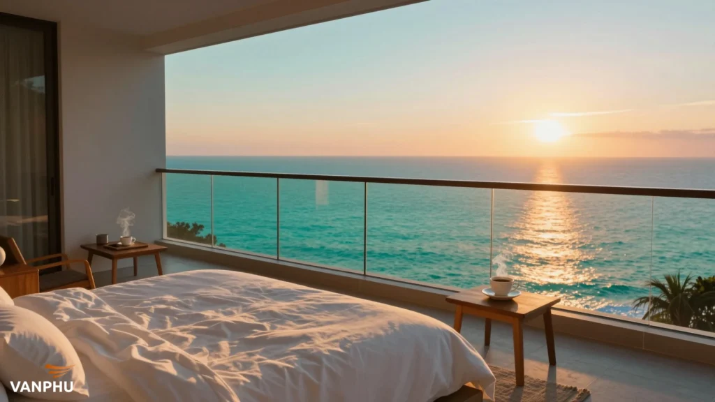 Ánh nắng bình minh nhẹ nhàng xuyên qua cửa sổ, đánh thức mọi giác quan một cách êm dịu nhất. Bạn bước ra ban công, hít một hơi thật sâu không khí trong lành và thanh khiết. Mọi lo toan của cuộc sống đô thị dường như tan biến theo những bọt sóng trắng xóa ngoài xa.