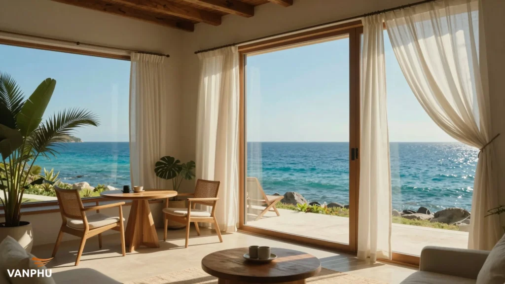 Tận dụng tối đa ánh sáng tự nhiên và tầm nhìn hướng biển là một lợi thế. Những ô cửa sổ lớn hay ban công rộng sẽ là điểm cộng rất lớn trong mắt khách hàng. Đừng quên trang trí thêm cây xanh để không gian trở nên sinh động và gần gũi hơn. Bạn có thể tham khảo thêm về thiết kế căn hộ phong cách biển cho người trẻ để tìm cảm hứng.