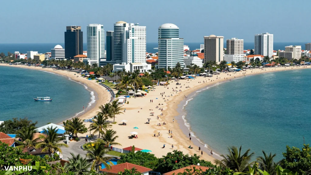 Một thành phố biển năng động của Việt Nam, nơi kiến trúc hiện đại hòa mình vào cảnh quan thiên nhiên tươi đẹp, với biển xanh và cuộc sống sôi động. — Hình ảnh được tạo bởi AI
