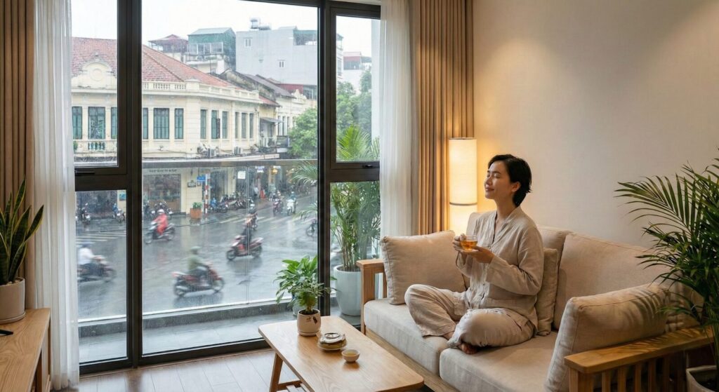 Nhưng có đến chơi nhà, ngồi lại sau cánh cửa dày cộp, tôi mới thấu hiểu cuộc chiến không hồi kết của anh. Đó là cuộc chiến với tiếng còi xe inh ỏi vọng vào bất kể ngày đêm, là lớp bụi mịn phủ lên bậu cửa sổ mỗi sáng, và là sự thiếu hụt trầm trọng một không gian riêng tư. Ngôi nhà vật lý của anh rất đắt giá, được định giá bằng những con số khổng lồ, nhưng “ngôi nhà tâm trí” của anh lại chật chội, ngột ngạt và nghèo nàn sự bình yên. Tiếng ồn, ô nhiễm và sự căng thẳng thường trực là cái giá phải trả cho sự sầm uất.
