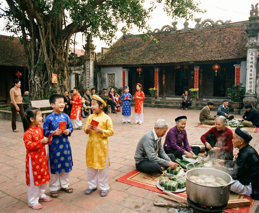 Ký ức Tết trong tôi là những con ngõ nhỏ thông nhau, là cái sân đình rộng thênh thang nơi đám trẻ con xúng xính áo mới khoe nhau từng bao lì xì, là nơi các cụ ông cụ bà ngồi bàn chuyện gói bánh, luộc giò. Cái sân đình ấy, cái đầu ngõ ấy chính là “trạm trung chuyển” của mọi thông tin, mọi cảm xúc.